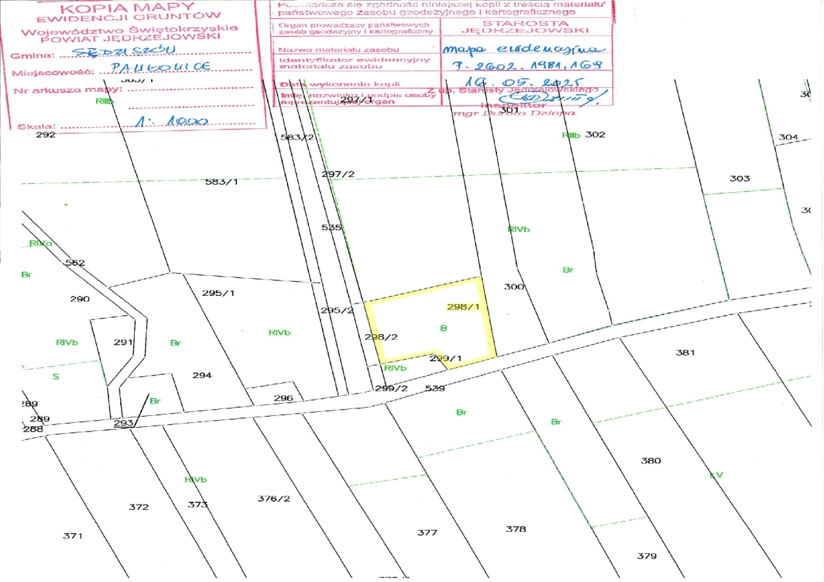 Działka gruntu nr 298/1 o pow. 0,11 ha , położonej w miejscowości 38-340 Pawłowice 27, zabudowana budynkiem mieszkalnym jednorodzinnym oraz zabudowaniami gospodarczymi, dla której prowadzona jest księga wieczysta nr KI1J/00031984/2 przez Wydział Ksiąg Wieczystych Sądu Rejonowego w Jędrzejów.